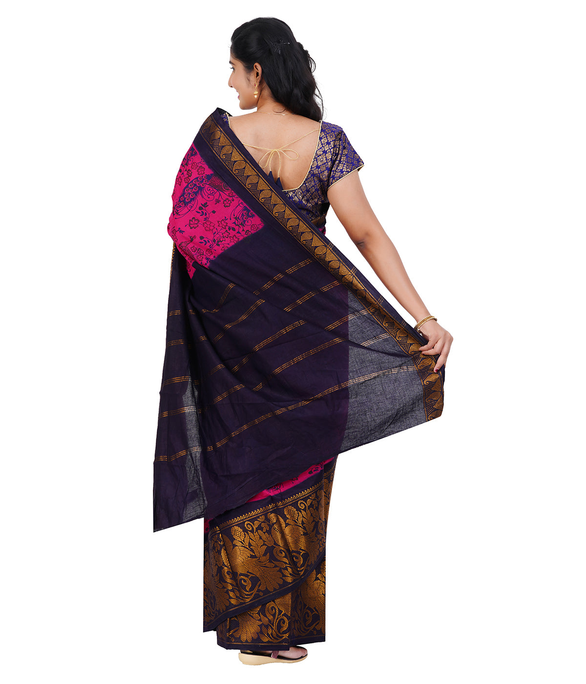 This stunning pink saree features intricate floral patterns beautifully complemented by a rich navy blue border with golden zari weaving. The elegant navy blue blouse with golden motifs adds a royal touch, making it a perfect choice for weddings, festive celebrations, and traditional gatherings. The bold color combination of pink and blue with shimmering zari work enhances the overall charm, giving you a graceful and regal look.